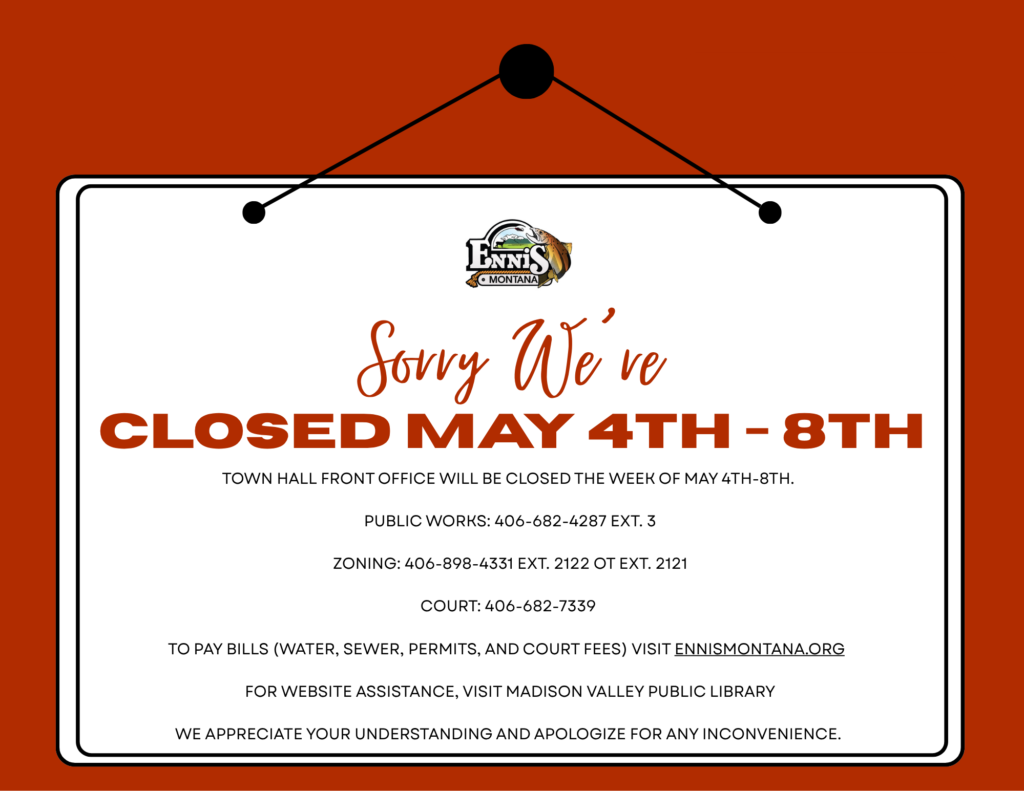 Town Hall Front Office will be closing at 12:00pm today and re-open Monday 4/6/2026. If you need assistance please call 406-682-4287 and select the department from the menu. Visit our website for information and to pay utility bills https://www.ennismontana.org/… Read More