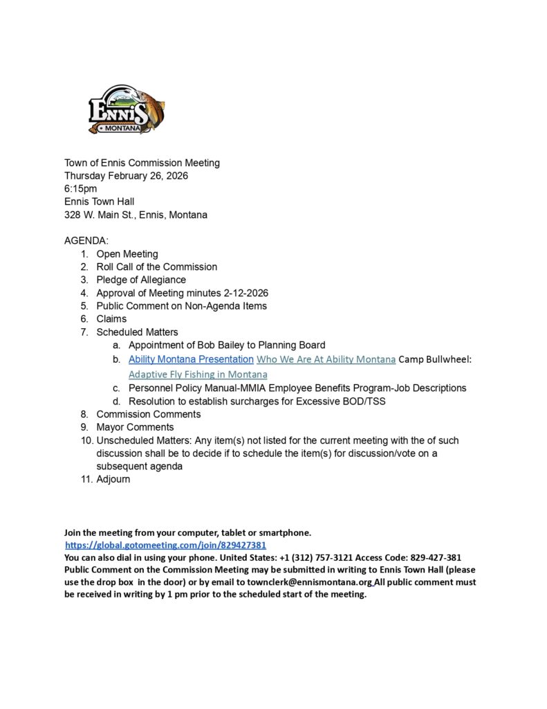 Scheduled Ennis Town Commission Meetings are held the second Thursday of the month at the time posted on the agenda. You can view the meeting recordings on our YouTube Channel. Meeting agenda's and packets are available for viewing on the Town Commission page.